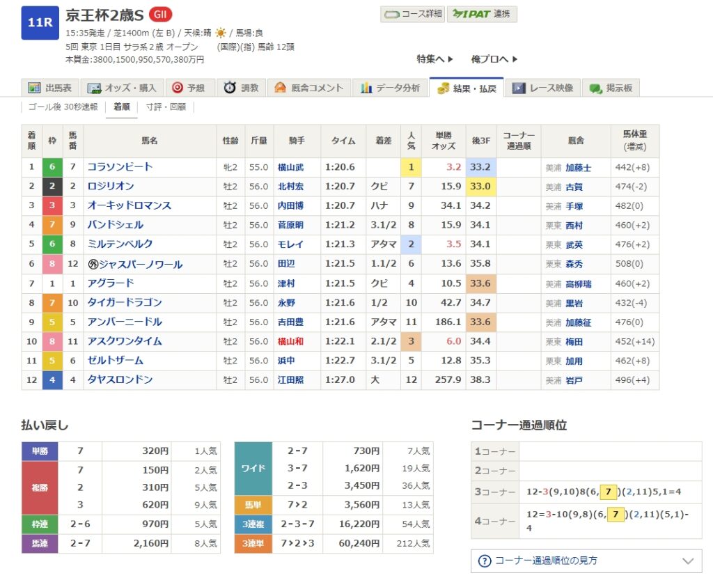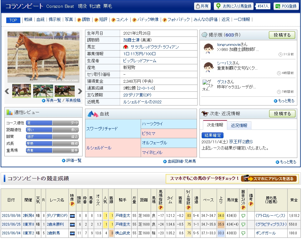 2023京王杯2歳S(G2)の優勝馬はコラソンビートでした。調教師は美穂の加藤士津さん(美穂)、馬主はサラブレットクラブ・ラフィアンのクラブ馬です。出資者の皆さん、おめでとうございます!生産はビックレットファーム。主な勝鞍は2023ダリア賞(OP)です。ジョッキーは横山武騎手、戸崎騎手から乗り替わりで、見事に重賞を制覇しました。通算成績は4戦3勝のG2ウィナーになりました。来年のクラシックホース候補として一歩先に躍り出たのではないでしょうか。また、今年は栗東ではなく、美穂所属、関東馬の活躍が目立ちますね。イクイノックスも、牡馬の2023年クラシックホースは3頭いますが、いずれも関東馬でした。一方で2023年牝馬三冠を達成したリバティアイランドは関西馬です。